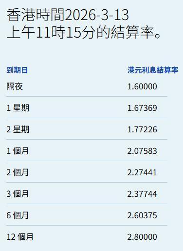 隔夜息报1.6%,升2.845基点;一周拆息升3.059基点,报1.67369%,两周则升3.506基点,报1.77226%。长息方面,六个月拆息无升跌,报2.60375%,一年期则升2.393基点,报2.8%。