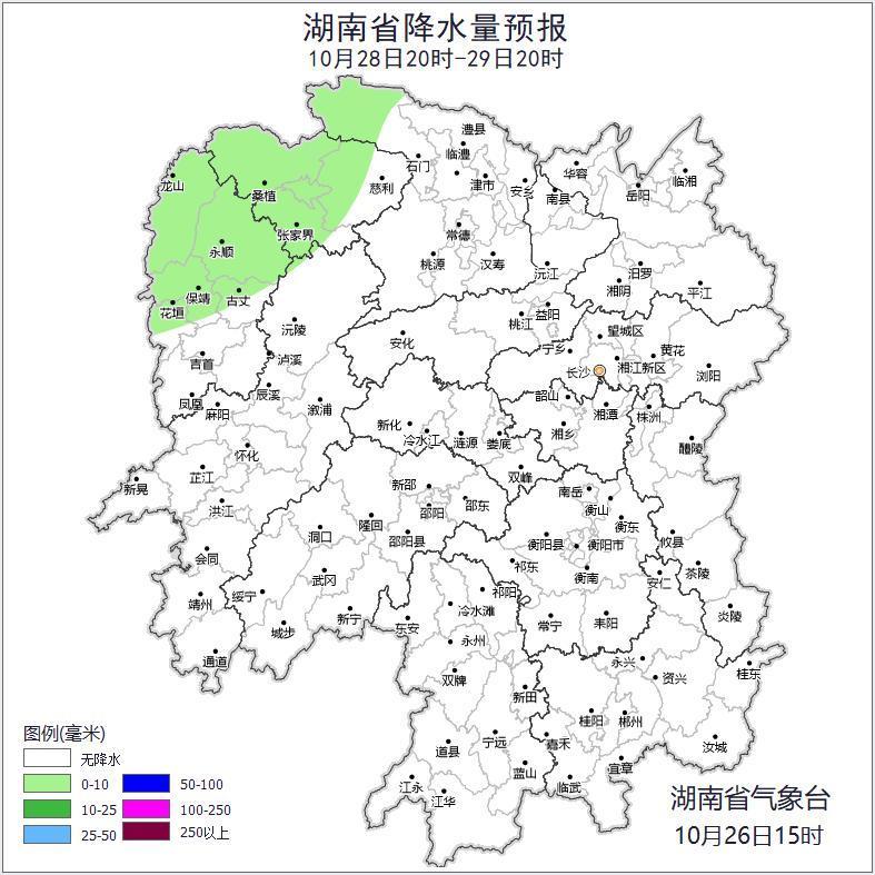 28日晚上至29日白天,湘西北多云转小雨,早晨有雾,其他地区晴天到多云;北风2~3级;最低气温湘西10~12℃,其他地区12~15℃,最高气温湘南25~28℃,其他地区23~25℃。